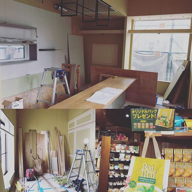 カウンターが付きました️内装屋さんがこれからはメインに。そしてカルディで#roithai カレー買うとバッグもらえるフェア。カレー好きとしては即決でしたこれ持ってたらカレー仲間と勝手に思い込む予定#おうちかふぇ #おうちカフェ #カフェ計画 #カフェができるまで #カフェ建築中 #店舗併用住宅 #家カフェ #herbcafe #medicalherb #ハーブ #メディカルハーブ #メディカルハーブカフェ#ハーブカフェ